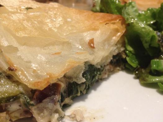 Rabattre les morceaux de feuilles de brick à l’intérieur du plat et couper le tout en 4 parts avant d’enfourner. Enfourner 20′ à 210°C avec chaleur par le haut pour que le feuilleté soit bien doré et croustillant.